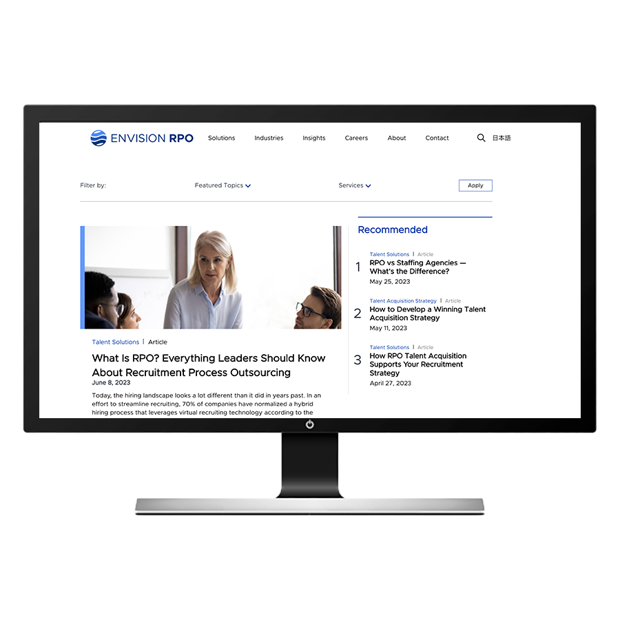 採用のスペシャリストであるエンビジョンのRPOは、最新の採用動向を把握しています。 当社のデジタルライブラリーには、今日の人材を取り巻く状況を理解するのに役立つ、業界の深い知識、アドバイス、情報が掲載されており、クライアントの採用活動を効率化させるのに役立ちます。